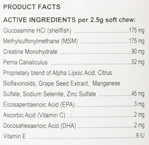 -. Feature : Full-strength synovial support supplement / Supplying arthritic patient with Glucosamine / Highly palatable liver-flavored chew / Contains MSM / Contains Glucosamine