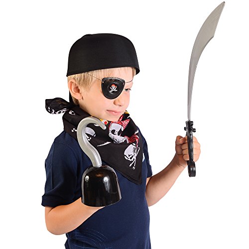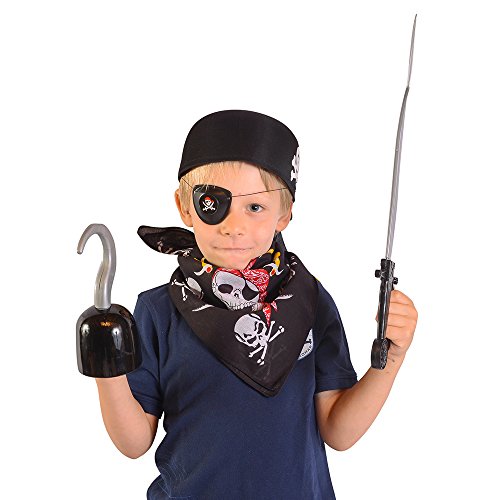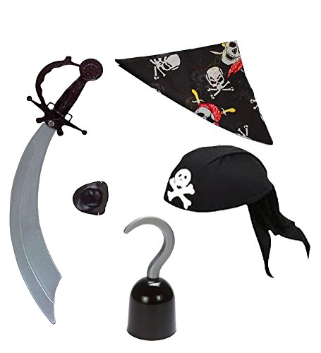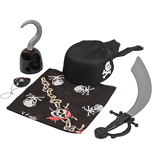 -. Binding : Toy -. Brand : Funny Party Hats -. Color : Black, White, Silver, Red -. Department : unisex-child -. EAN : 0612524323529 -. Feature : Set of Pirate Gear Will Have Your Child Searching For Hidden Treasure in No Time. / This 5 piece Set Includes a Child Size Skull Design Pirate Scarf ( Design May Vary) , a Hat, a Hand Hook, a Sword and an Eye Patch / This Set Provides Hours of Role Playing Fun as You Swab the Deck and Go on a Swashbuckling Adventure Looking Out for the Secret Island. / A Fun Birthday and Halloween Accessory Kit. Perfect for Dress Up and Role Playing / It Can Be Worn Any Day of the Week for Dress up Play and Fun. This Comfortable Accessory Set Can Be Worn Over and Over Again. -. IsAdultProduct : 0 -. Label : Funny Party Hats -. Manufacturer : Funny Party Hats -. Model : f-30212-am839-am903-am368 -. MPN : Pirate-set -. NumberOfItems : 1 -. PackageQuantity : 5 -. PartNumber : Pirate-set -. ProductGroup : Apparel -. ProductTypeName : TOYS_AND_GAMES -. Publisher : Funny Party Hats -. Size : One Size -. Studio : Funny Party Hats -. Title : Child Size Pirate Costume Set (Set of 5) -. UPC : 612524323529