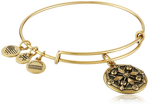 Expandable wire-bangle bracelet featuring center charm and three smaller logo charms
