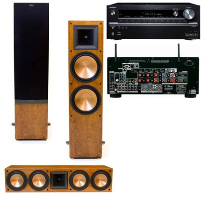 -. Feature : You Receive: 2 Klipsch RF-7II Cherry... 1 Klipsch RC-64II Center Speaker... 1 Onkyo TX-NR838 7.2-Ch Network A/V Receiver / The ultimate in Reference Series performance, the RF-7 II tower speaker lets you experience the true power, detail and emotion of cinematic spectacles and concert performances from the comforts of home. / Overview Destined to intoxicate hi-fi enthusiasts as much as serious film and game lovers, the TX-NR838 Network A/V Receiver combines pure analog power with the latest in high-resolution audio and video processing. This heavyweight receiver is built around Onkyo's acclaimed WRAT high-current architecture with a massive customized transformer and discrete Three-Stage Inverted Darlington Circuitry amplification. / Top center channel in the Reference Series line Designed to perfectly complement the RF-7 II floorstander Delivers precise dialogue, along with the deepest bass in its class Highly efficient design produces more output using less energy Magnetically shielded drivers prevent TV interference Dynamic 1.75" titanium horn-loaded tweeter, four 6.5" high-output woofers Dimensions: 8" H x 35.75" W x 13" D Tilt rod compensates for placement above/below seated ear height Beautiful furniture-grade wood veneer cabinet Every great home theater experience starts with a superior center channel. We hope your movie dialogue is good because with our top-of-the-line Reference Series RC-64 II you're going to hear every word of it.