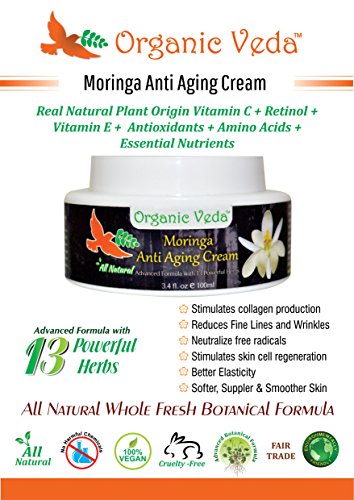 - ★ ANTI-AGING PROPERTIES Rejuvenates dull, Tired and Aging Skin. Antioxidants and Nutrients help fight free radical damage that can cause skin tissue damage and lead to the formation of wrinkles. Pure Moringa ingredients help improve the appearance of wrinkles and prevents sagging of facial muscles. Plant hormones called cytokinins, which help promote cell growth and delay damage and destruction of skin tissues.