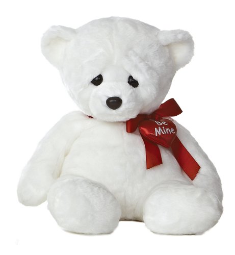 -. Feature : Made with super soft material / Wears a red ribbon bow and shimmery red heart bauble / Has an endearing facial expression