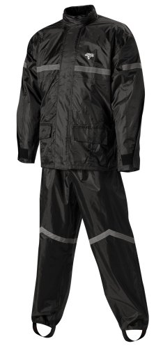 ReleaseDate : 2012-11-30 Studio : Nelson-Rigg Publisher : Nelson-Rigg Binding : Automotive Product Description Two-piece, 100 percent waterproof rain suit will keep you dry and comfortable in the wettest weather. Soft polyester outer shell with PVC backing and reflective striping on both jacket and pants for night visibility. Jacket has full-length zipper with Velcro storm flap and a soft corduroy inner collar with hood. Two large outer pockets, cooling vents under each arm, elasticized waist, and adjustable cuff with Velcro tabs. Pants feature elasticized waist band, cuffs, oversized zipper gussets and elasticized boot stirrups. 2 year 'no hassle' warranty. 0
