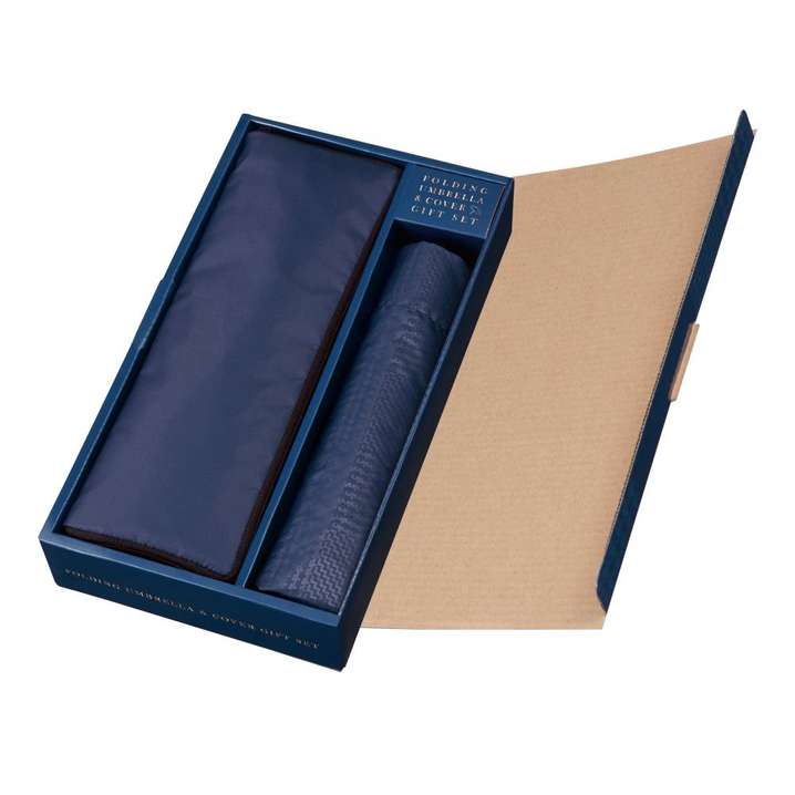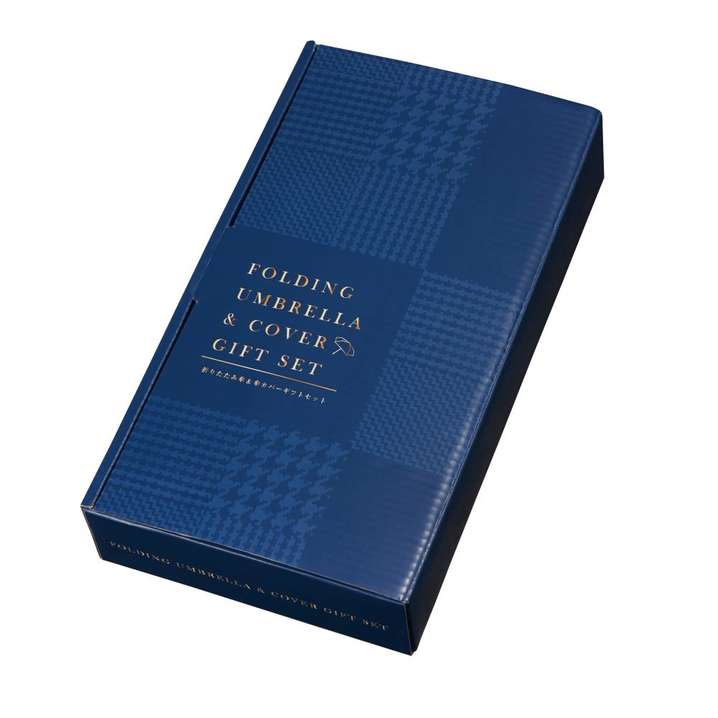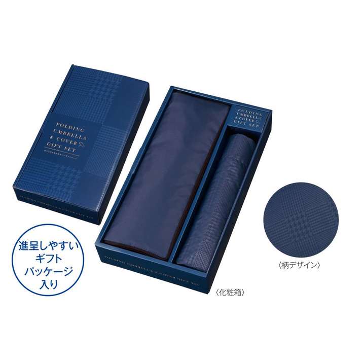 ●トラッドなチェック柄の透かしが入った折りたたみ傘と、ネイビーでシンプルなデザインが使いやすい傘カバーのギフトセットです。ブック型のパッケージで上質感があります。