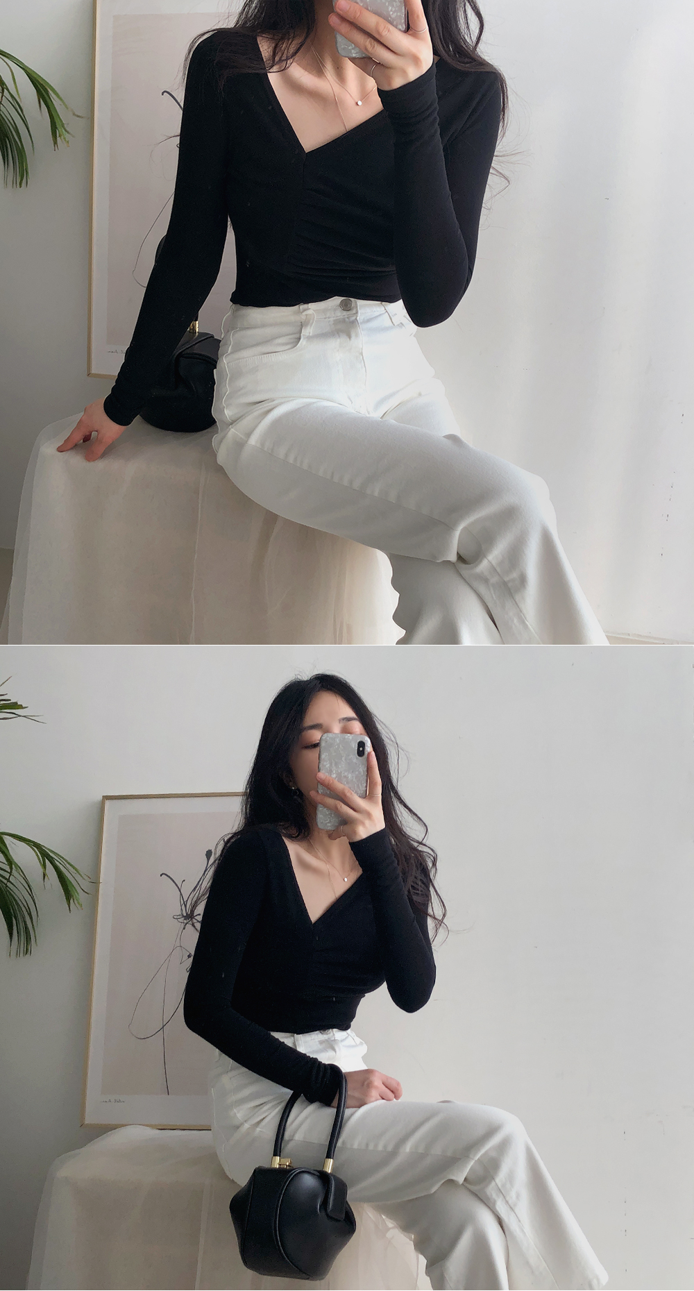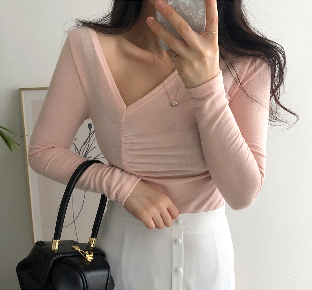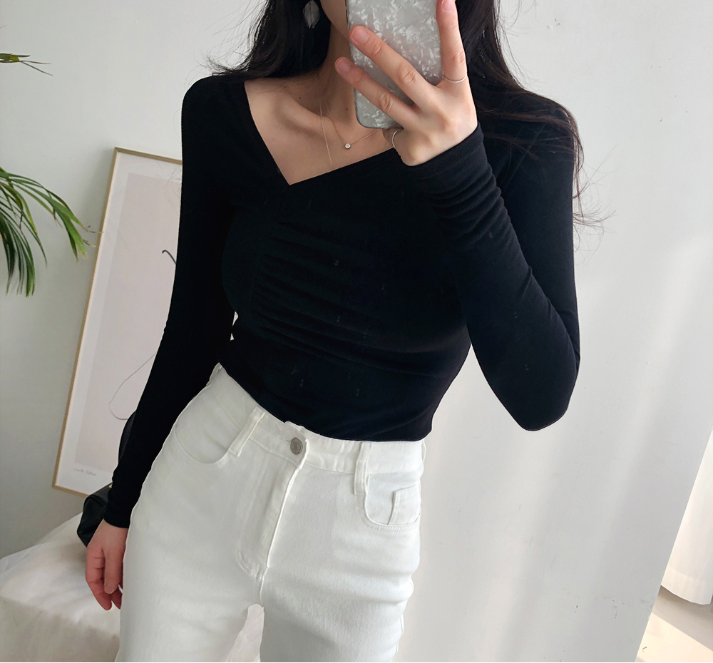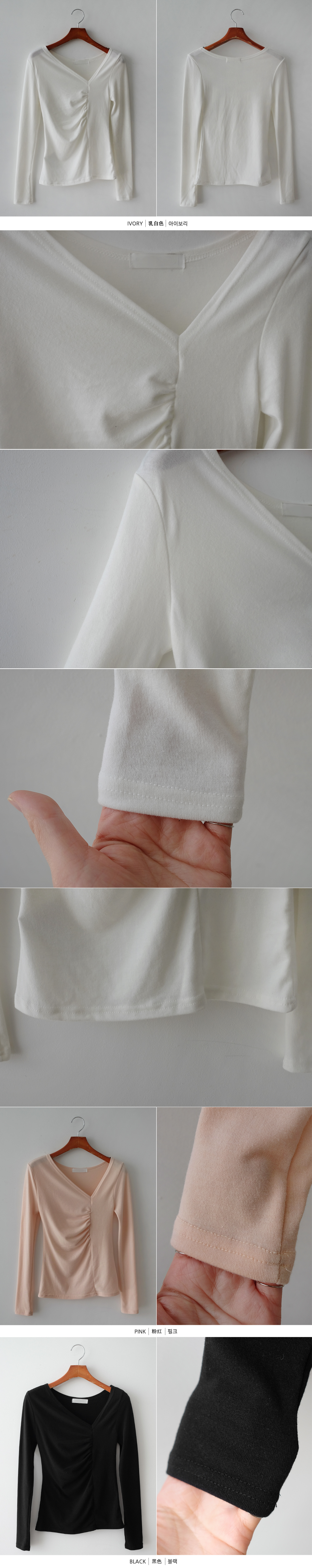 쇄골 포인트 사선 셔링 슬림 봄 브이넥 긴팔 티셔츠