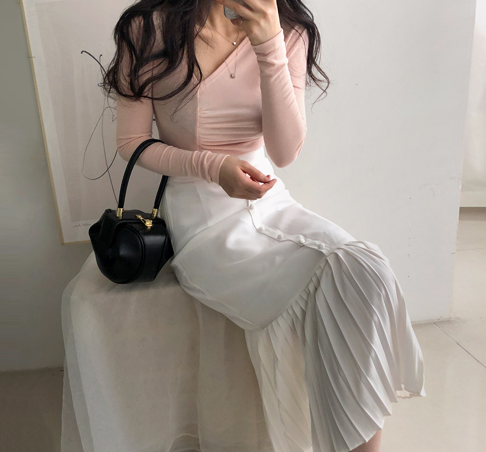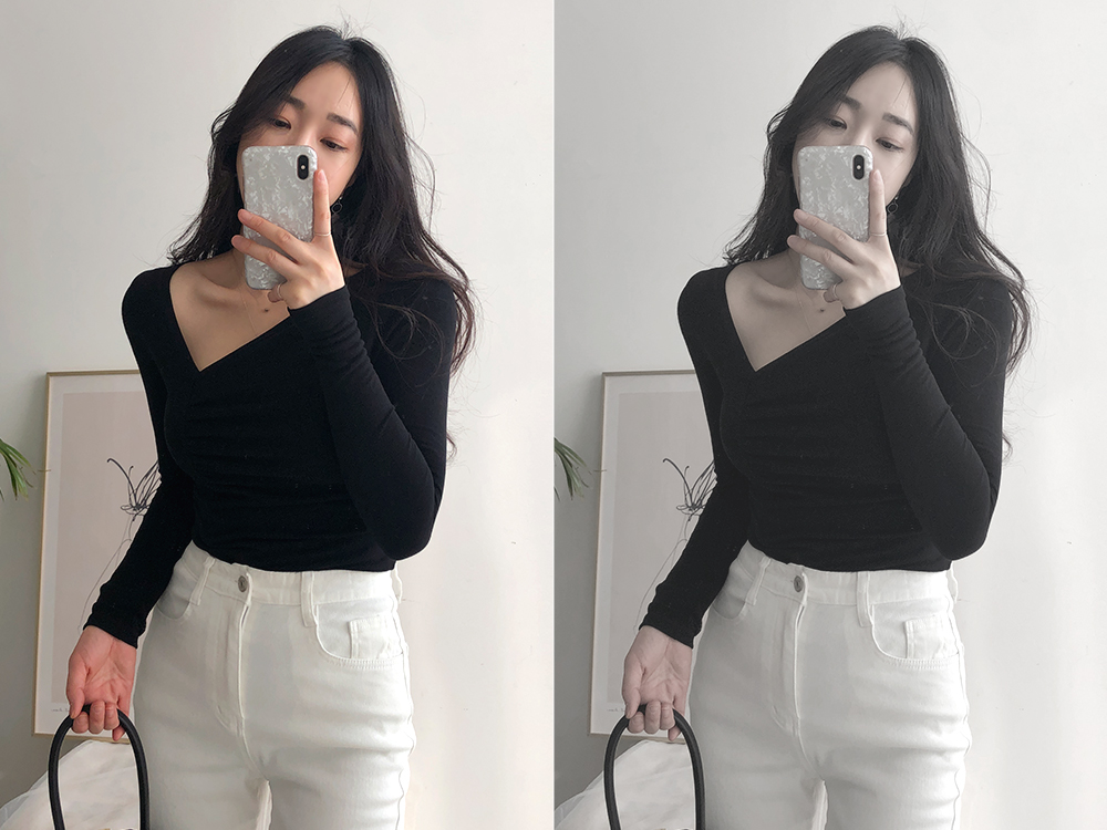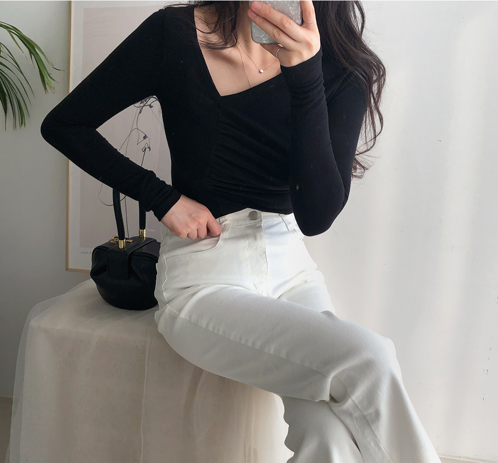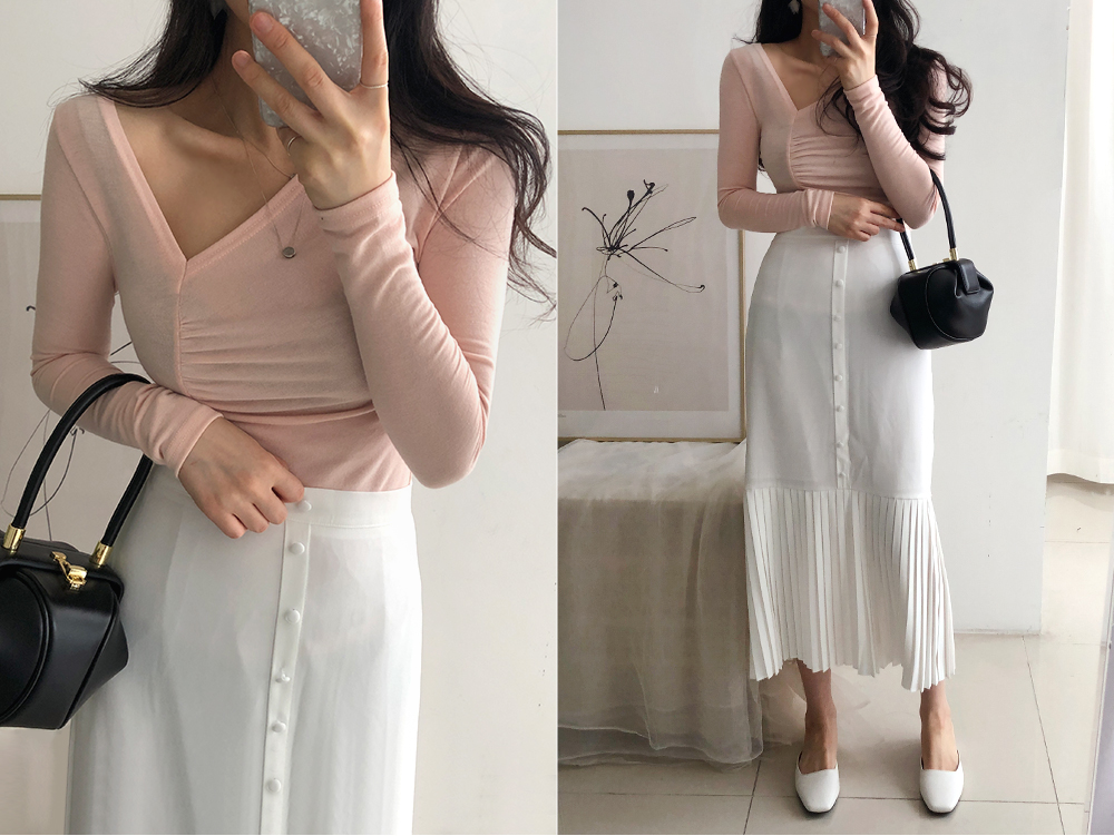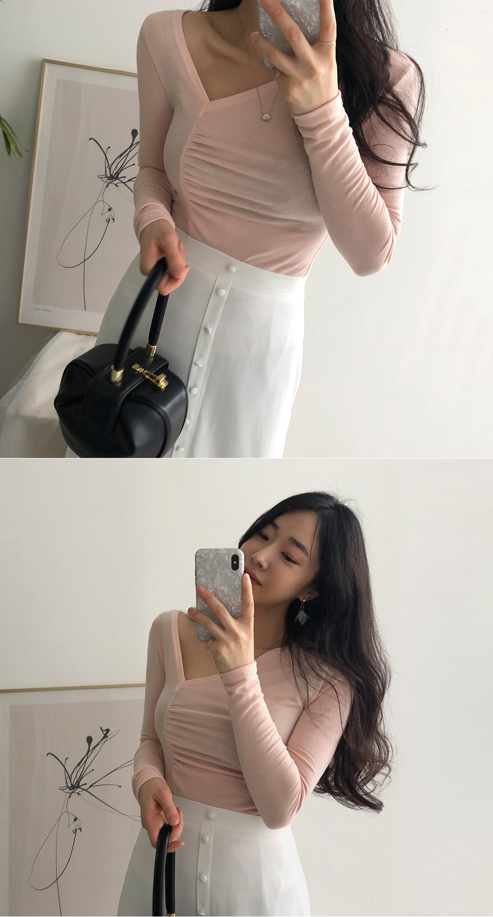 쇄골 포인트 사선 셔링 슬림 봄 브이넥 긴팔 티셔츠