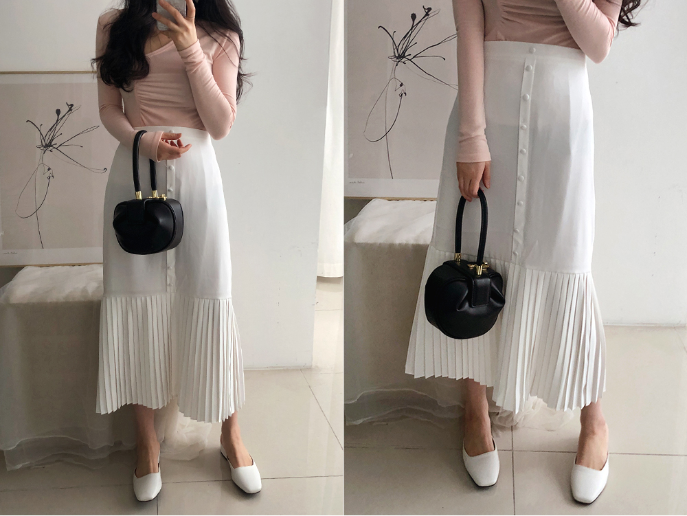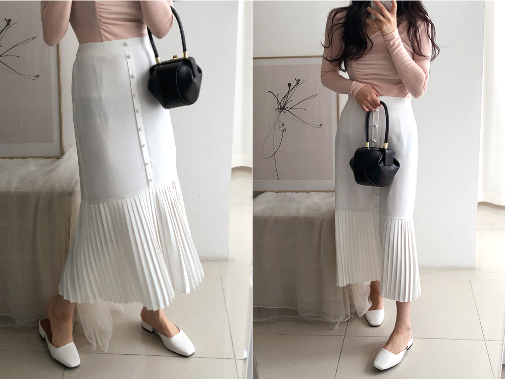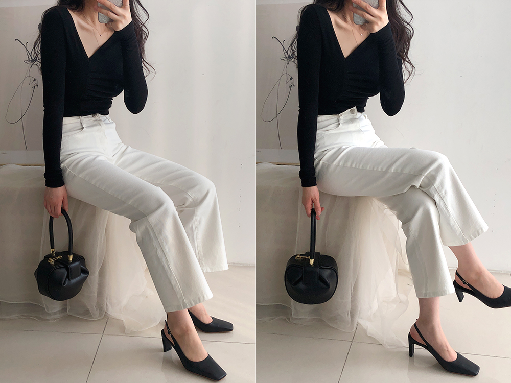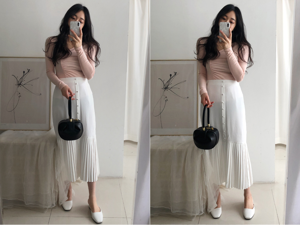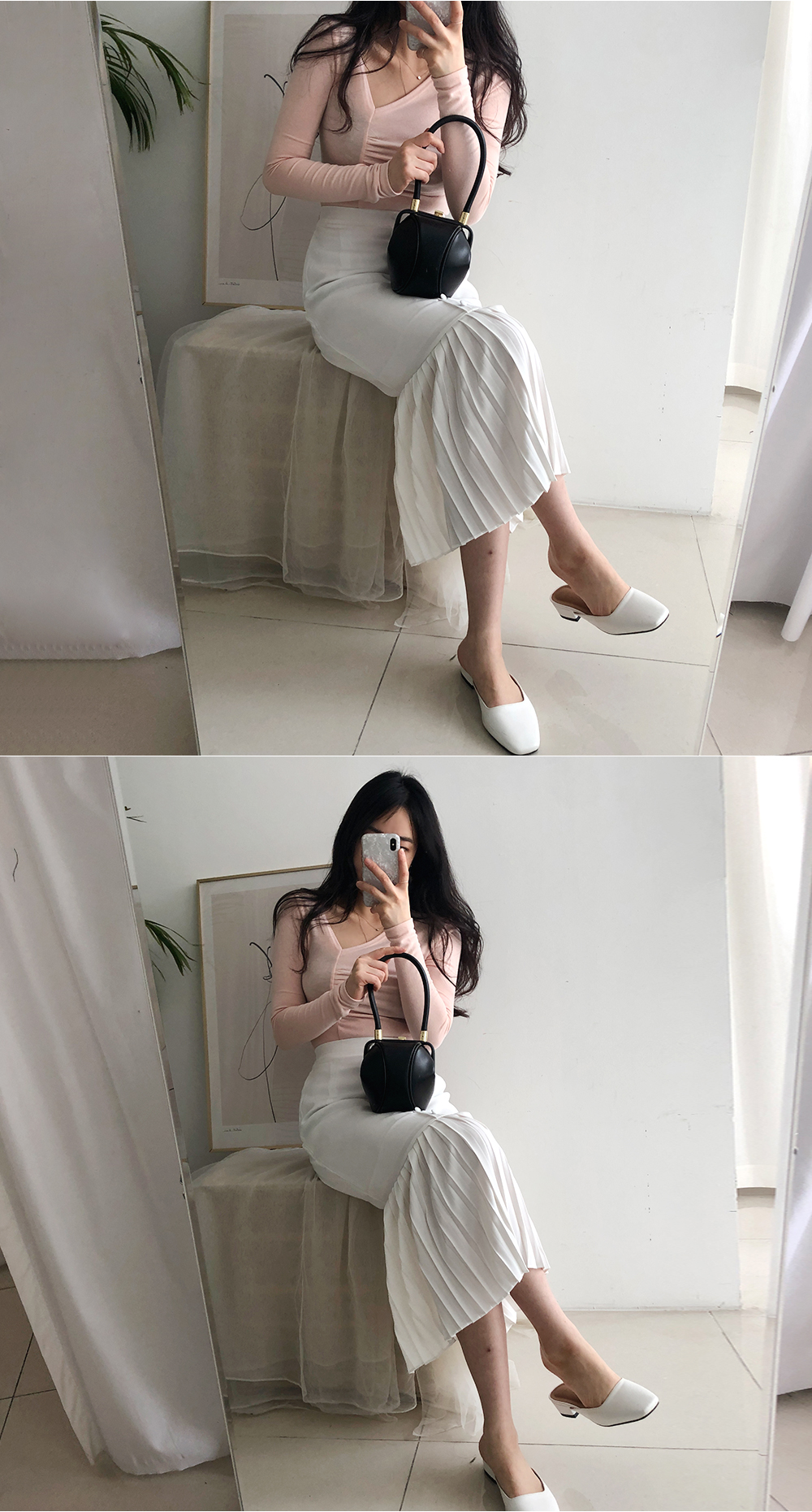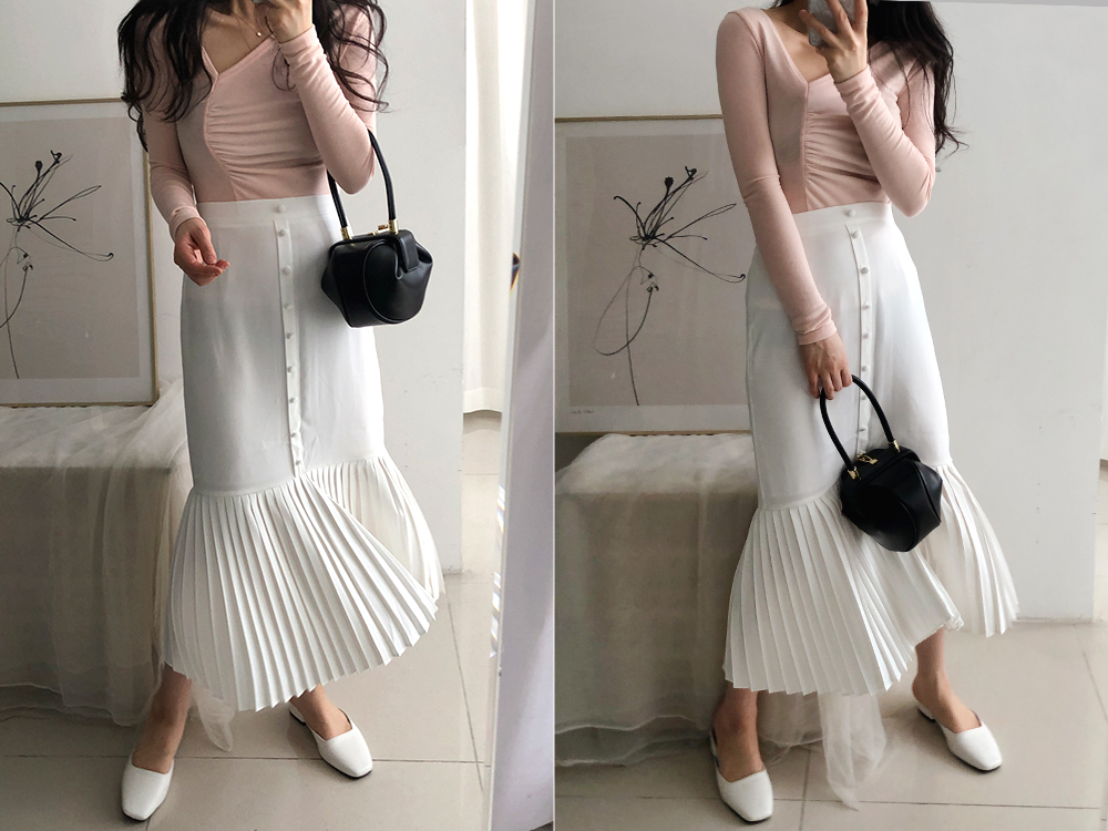 셔링 디테일로 페민닌한 무드를 한층 업 시켜드렸답니다.