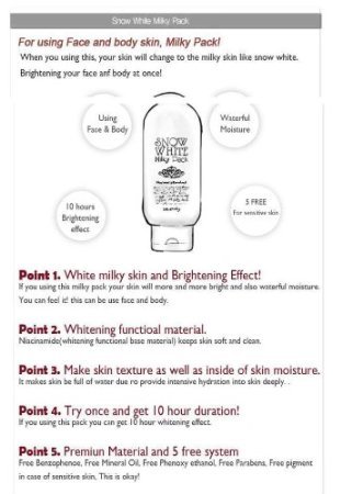 -. Binding : Misc. -. Brand : Secret Key Snow White -. EAN : 8858891300110 -. Feature : Mark the skin immediately a mixture of milk. Add a smooth surface. The need for urgent skin / Skin like the princess Snow White / For coating is 20-30 then wash out the white insert instantly. / The skin available delicate and sensitive. / Guarantee 100% Genuine Product / World Wide Shipping /Ships from and sold by Variety ETC. -. IsAutographed : 0 -. IsMemorabilia : 0 -. Label : Secret Key Snow White -. Manufacturer : Secret Key Snow White -. Model : B-7293342 -. MPN : B-7293342 -. PackageQuantity : 2 -. PartNumber : B-7293342 -. ProductGroup : Beauty -. ProductTypeName : BEAUTY -. Publisher : Secret Key Snow White -. Studio : Secret Key Snow White -. Title : Best Mask Cream Secret Key Snow White Whitening Milky Pack Mask for Face and Body 200 Ml X 2 Tubes
