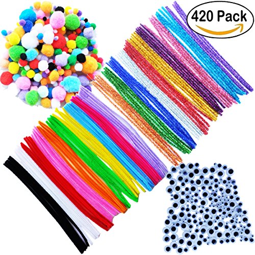 420 Pieces Pipe Cleaners Set, Including 50 Pcs 10 colors pipe cleaners, 50 Pcs 10 Colors Chenille Stems, 200 Pcs 6 Size Pom Poms and 120 Pcs 3 Size Wiggle Googly Eyes for Craft DIY Art Supplies
