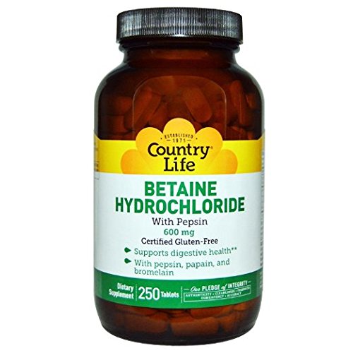 BETAINE HYDROCHLORIDE 600 mg w/Pepsin (Dietary Supplement). Directions: Adults take two (2) tablets with each protein-containing meal. As a reminder, discuss the supplements and medications that you take with your health care providers. Other Ingredients: Cellulose, stearic acid, cellulose & glycerin coating, silica, lactose, magnesium stearate, vanilla, vegetable glaze. Contains milk. Does Not Contain: Yeast, wheat, soy, gluten, salt, or artificial color.Feature