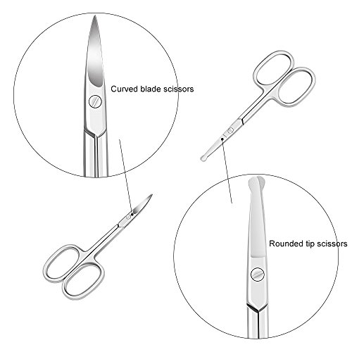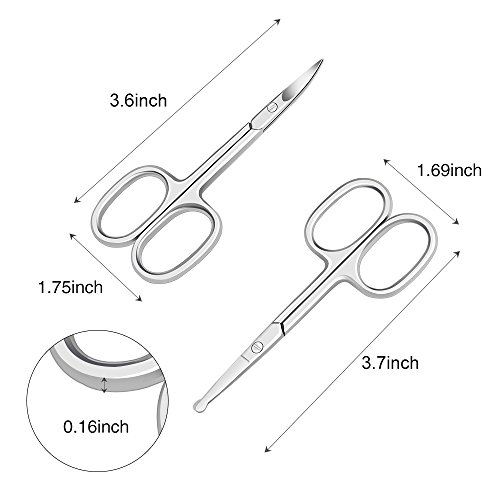 - MULTI-FUNCTIONAL- These hair grooming scissors include two pair of scissors. Safety rounded tip scissor is perfect for nasal and ear hair removal or kid’s hair trimming, it won’t accidentally poke, hurt your sensitive nostrils or skin. Sharp curved blade scissor is excellent for trimming beard, upper lip hair, mustache, eye lashes, shaping eyebrow, brows, mustache, cutting nails and hangnails. Meeting various cutting needs