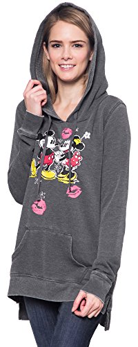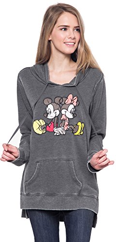 Disney Juniors pullover hoodie with front pouch pocket. Front graphic prints with Mickey & Minnie Mouse are distressed for vintage/retro look. Long sleeves, high-low hem, and drawstring hood. It is Light Weight, French terry and is very soft.Feature