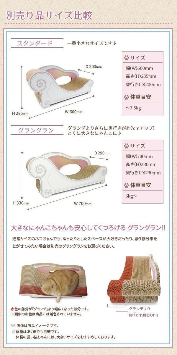 | 猫をこよなく愛す方々の猫ちゃんたちから情報を収集し「ネコがリラックスするカタチ」を研究し、構築した「にゃん工学」に基づいた設計のおしゃれな爪とぎソファーです。削りカスがほとんど出ない強化ダンボールを使用し、国内で製造しているので大切な家族の一員に安心してお使いいただけます。お部屋のインテリアに合わせてお選びいただけるよう、3色をご用意しました。スタンダード(M)より、横幅と奥行きがアップした商品です♪ |