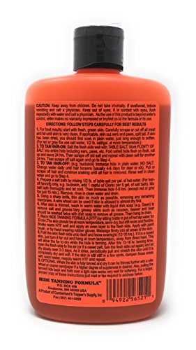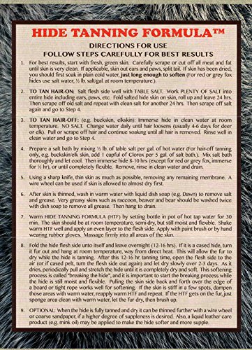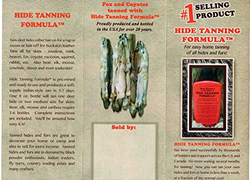Trapper's Hide and Fur Tanning Formula. You can tan your own furs and hides. Works for professional taxidermy use and home tanning. 8 oz. Bottle tans one deer hide or several furs. Tans deer either hair-on to make a deerskin rug or mount, or hair-off to make buckskin leather. Tans all fur skins- deer, coyote, fox, raccoon, squirrel, rabbit, muskrat, beaver and others. Also works on elk, moose, caribou, bear, and even snakeskin.Feature