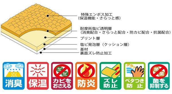 お部屋をいつも清潔に保てる超機能性マットです。抗菌・防カビ・消臭効果により、トイレを清潔に保つことができます。表面に特殊エンボス加工を施しているので、夏はベタつかず、冬は保温性があるのでヒヤッとしません。汚れてもサッと拭きとるだけで、洗濯も不要。自分でカットして簡単に設置できます。 |