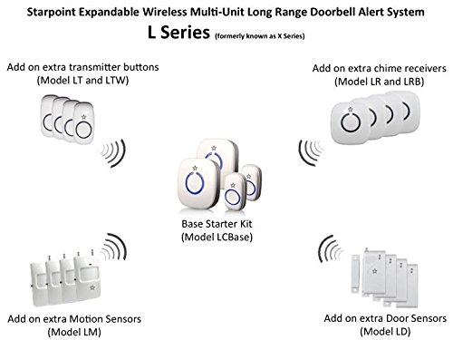The STARPOINT Expandable Wireless Multi-Unit Long Range Doorbell Alert System Learning Code "L" Series is a CONFIGURABLE and EXPANDABLE doorbell system that can EASILY ADD on 20+ more extra receivers, transmitter buttons, motion sensors and door sensors.