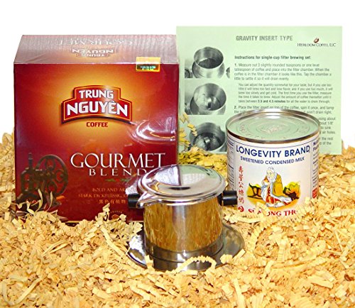 -. Feature : Contains Trung Nguyen Creative 2 coffee, 6 ounce Trung Nguyen logo-embossed Phin filter/brewer, 14-ounce Longevity sweetened condensed milk, and pictorial instructions for making Café Sua Da. / Recreate the genuine Vietnamese coffee shop experience, brew either iced coffee or hot / Traditional Phin brewer with Trung Nguyen embossed logo, stainless steel, 6 ounce / Pictorial instructions to help you make perfect Vietnamese coffee the first time / This kit is only available as pictured from HEIRLOOM COFFEE LLC.