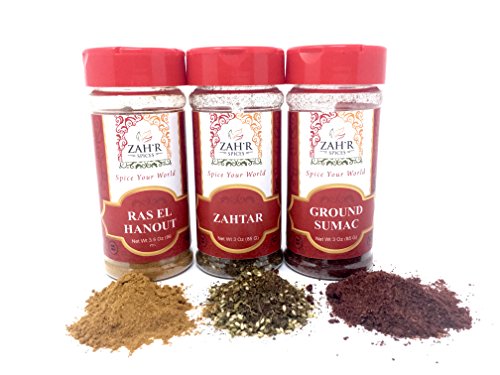 -. Binding : Misc. -. Brand : Zah'r Spices -. EAN : 0600154164636 -. Feature : Essential Moroccan Spice Trio of Zahtar, Ground Sumac and Ras El Hanout. Full size 3-3.5 oz bottle of each spice for a complete set of three spices. / Perfect variety pack of authentic Moroccan Spices. / Traditional seasoning blends make Middle Eastern recipes easy and delicious. / Makes a great gift for any cook! -. Label : Zah'r Spices -. Manufacturer : Zah'r Spices -. ProductGroup : Grocery -. ProductTypeName : GROCERY -. Publisher : Zah'r Spices -. Studio : Zah'r Spices -. Title : Zah'r Spices Moroccan Spice Trio - Zahtar, Ground Sumac and Ras El Hanout Variety Pack -. UPC : 600154164636