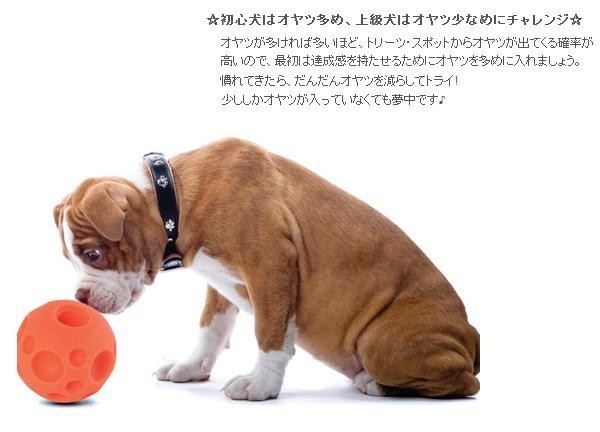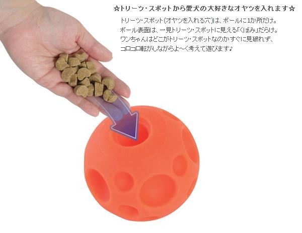 | ボールの1か所に空いている穴からオヤツを入れることができます。周りには穴に見せかけたくぼみがたくさんついており、ワンちゃんはボールの中のオヤツを取り出そうと夢中でボールをコロコロ転がします。どうやったらオヤツが出てくるのかを考えながら遊ぶため、ワンちゃんの知育トイとしてぴったりです♪オヤツなしでも普通のボールとしてレトリーブ遊びもできます。 |