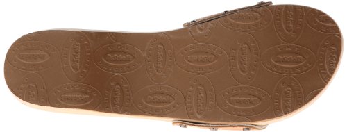 -. Feature : Slide sandal with wide, buckled strap attached with nailheads to contoured, faux-wood footbed