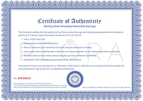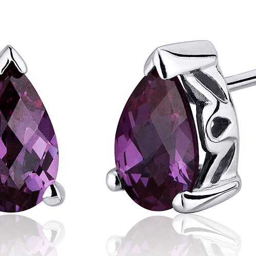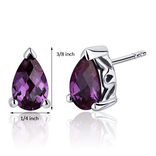 Center Stone: 2 Pieces Simulated Alexandrite, Pear Shape with Checker Board Top 8 x 5 mm, 2.00 carats total weight, Changes Hue depending on lighting: Deep Pink, Dark Purple, Rich Blue, and Ocean Teal, Brilliant Sparkle. Earrings: 2.10 grams, Pure Sterling Silver Rhodium Finish with .925 stamp, Earrings feature Stud posts with Bullet backs, exceptional Design, Craftsmanship and Rhodium Finishing. Perfect gift for Mothers Day, Birthdays, Valentines Day, Graduation, Christmas or just about any other occasion. Money Back Guarantee. Includes a Signature Gift Box & style SE8048