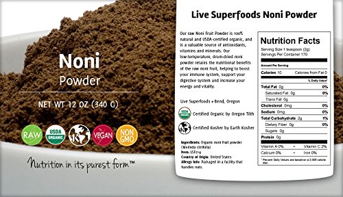 Studio : Live Superfoods Publisher : Live Superfoods Binding : Health and Beauty Product Description Live Superfoods Noni Powder, 12 oz Our raw Noni Fruit Powder is 100% natural and is a valuable source of antioxidants, vitamins and minerals to boost energy and support a healthy immune system. A great addition to your smoothie or yogurt recipes. Many of our customers mix Noni powder in with water or juice, but because our Noni Powder doesn't contain any additives or carriers, it doesn't dissolve well in water. So, for best results we suggest mixing it with a smoothie or yogurt. Noni Powder - An antioxidant rich cargo Sometimes you can't improve the perfection of Mother Nature; that's why our Noni fruit powder is 100% natural, with nothing added and as little as possible taken away. Like many of our antioxidant rich Superfood Powders it's drum-dried; a process that removes moisture from the fruit at a very low heat. This allows the powder to retain the nutritional benefits of the raw Noni fruit, helping to boost your immune system, digestive system and increase your energy and vitality. Believed to have originated in India over 2000 years ago, the Noni fruit can now be found in India and the lush tropical islands of Hawaii and the South Pacific. Noni was a precious cargo. With limited space, bringing only the most vital items for future generations, ancient explorers made room for Noni fruit on their journeys to new lands. These intrepid travelers had many uses for the Noni tree beyond their faith in its medicinal benefits, but its primary value was as a medicinal remedy. Among its many uses, they believed that the Noni fruit strengthened the digestive system, helped increase energy and vitality, and had antibacterial and antiseptic properties. The Noni tree does especially well in the lava rich soil of the tropics; the Noni fruit looks like a little like a potato but grows from green, to yellow to a transparent white when ripened. They are picked when yellow for optimum nutritional 0