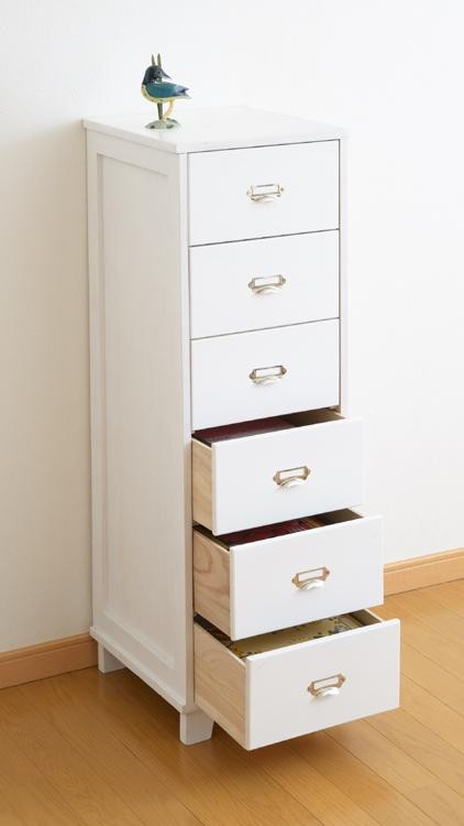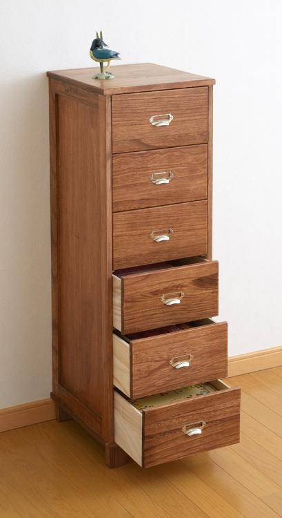 天然木を使用した収納チェストです。引出しの前板には中身を識別する紙がはさめるデザイン取っ手付きです。(紙はセットされておりません) |