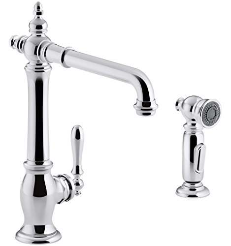 KOHLER K-99265-CP Artifacts Single-Hole Kitchen Sink Faucet with 13-1/2 In. Swing Spout, Two-Function Sidespray, and Victorian Spout Design, Polished Chrome