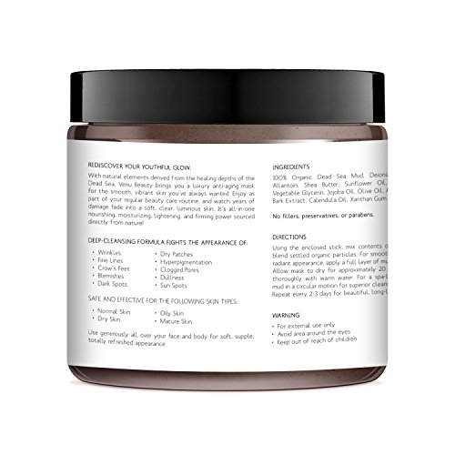 Studio : Venu Publisher : Venu Binding : Misc. Product Description Venu's Dead Sea Mud Mask is a 100% natural mineral infused face mask that uses powerhouse ingredients straight from the earth to detoxify, exfoliate, moisturize and turn back the hands of time, leaving you with a beautiful, youthful glow. About This Product: ? Dead Sea Mask (8.8 Fl. Oz.) ? Organic Natural Ingredients ? Detoxifies Cleanses ? Fights Acne Hyperpigmentation ? Safe Effective For All Skin Types ? No Preservatives, Fillers Or Parabens ? Easy To Use ? Perfect For Facials Deep cleaning is an important part of any serious skin care regimen and our face mask includes natural and healthy ingredients that gently yet effectively deep clean your skin for a full detoxification that will leave you feeling brand new. ?This mask is made up of a powerful blend of powerful ingredients from the earth that are popular for their ability to cleanse, detoxify, moisturize, tone, tighten and reverse aging. ?Our formula fights the appearance of: ? Wrinkles ? Fine Lines ? Crow's Feet ? Blemishes ? Dark Spots ? Dry Patches ? Hyperpigmentation ? Clogged Pores ? Dullness ? Sun Spots ? More Because of the natural and gentle ingredients we have used in this formula, this mask is safe for all skin types including normal, oily, dry mature skin. ?Just apply to the face and let dry for 20 minutes and let it work it's magic for complexion boosting benefits. Feel the natural power of: ? 100% Organic Dead Sea Mud ? Deionized Water ? Kaolin ? Shea Butter ? Sunflower Oil ? Aloe Vera Juice ? Jojoba Oil ? Olive Oil ? Almond Oil ? Hickory Bark Extract ? Calendula Oil ? More Reveal your skin's true potential with Venu's Dead Sea Mask today. 0