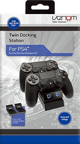 Keep controllers fully charged and ready for action with Venom's Twin Docking Station. The rapid recharge cradle enables you to power up two DUALSHOCK®4 wireless controllers. Featuring a polished black and matt finish to match your DUALSHOCK®4 wireless controllers and PS4TM system; red charging LED indicators turn blue once fully charged. No more cables! Simply attach the micro USB dongles provided for simple drop and charge.