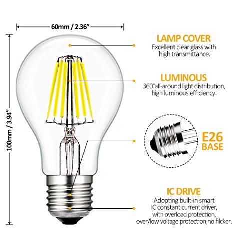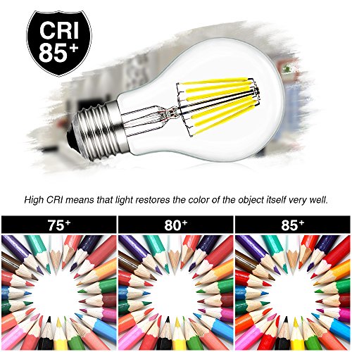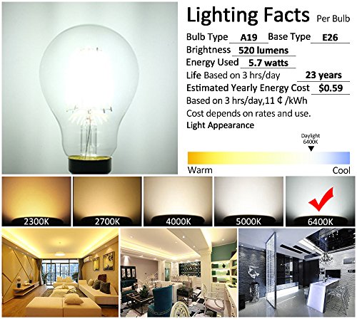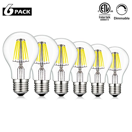 CREATE BRIGHT A19 LED Vintage Filament Bulb,6W(60W Incandescent Equivalent), Dimmable Edison Globe Bulbs,E26 Base,520lm,6400K Daylight,360°Beam Angle,ETL Listed,Pack of 6