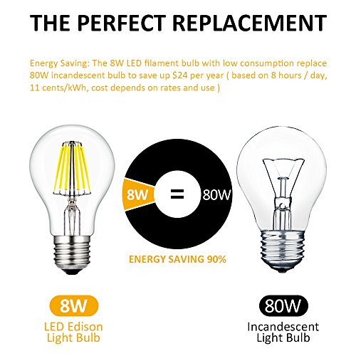 - ▲The LED filament bulb is an energy - saving alternative to a standard incandescent bulb.Save over 90% on electricity bill of lighting by replacing 60W with just 6W.Rated for an astonishing>30,000 hours of use-over 20 years on an average use of 3hrs/day! No more constant bulb replacement.