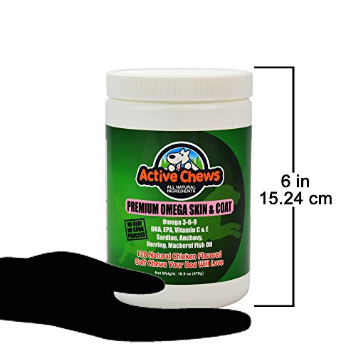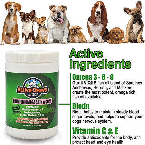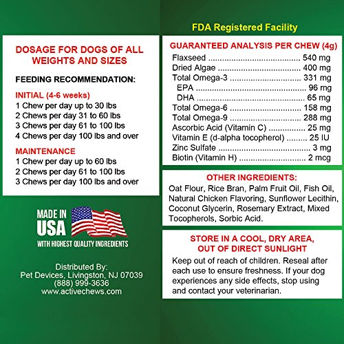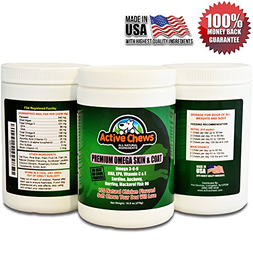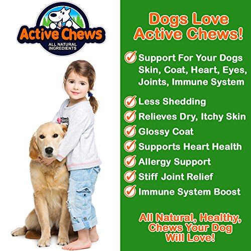 The Secret To Giving Your Dog Healthy Skin, Coat, Heart, Joints, and Immune System, Without Using Harmful Pharmaceutical Drugs! Does your dog have itchy skin, flaking, hot spots, and allergies? Are you looking for anti itch dog treats that reduce itching, sooth sensitive skin, support immune and heart health, without harmful pharmaceutical drug side effects? Give Your Dog All-Natural Premium Omega For Dogs From Active Chews and Watch Their Health Increase Significantly. Lots of meds from pharmaceutical companies contain dangerous drugs and chemicals with side effects that are often worse than your dogs symptoms. Our all natural, veterinary formulated, dog skin and coat supplements are made from high quality dog omega 3 fish oil. Our unique blend includes nutrients your dog needs to protect their skin, heart, immune system, and joints. Why Our Premium Dog Supplements for Skin and Coat Are Better! ? All Natural, Safe, Dog Treats with no adverse side effects providing Omega 3-6-9 for healthy skin, coat, heart, joint, and immune system health. ? Unique fish oil blend of Sardines, Anchovies, Herring, and Mackerel, creates the most potent, omega rich, fish oil available. ? Added Biotin ingredient maintains steady blood sugar levels, and supports the nervous system. ? Vitamins C and E provide antioxidants for the body, and protect heart and eye health. ? Our No Heat No Cook process ensures 100% potency. Other cooked treats lose over 50% of their potency. ? All Natural Chicken Flavor added to Our Fish Oil, creates a Flavor Profile Your Dog Will Love! ? USA Made in an FDA inspected Facility. ? 100% Money Back Guarantee!