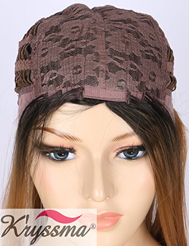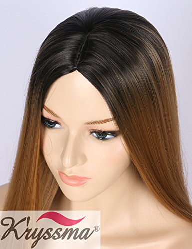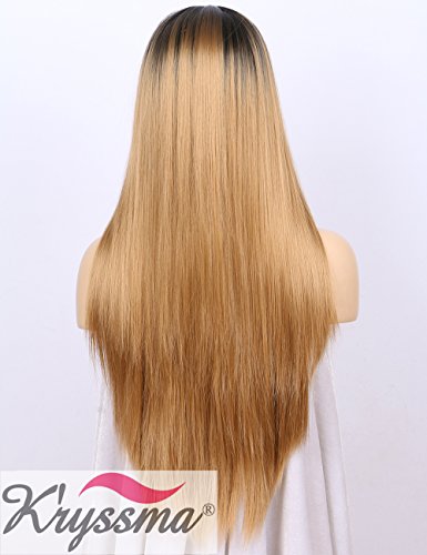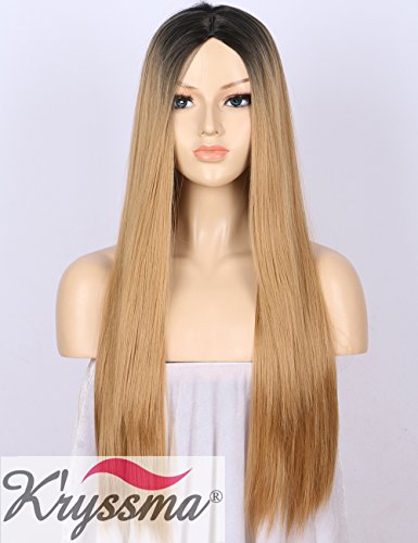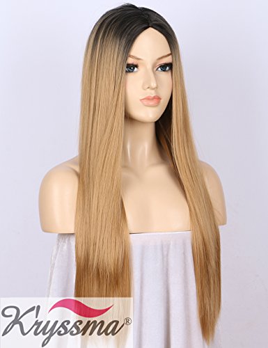 K’ryssma Ombre Synthetic Wig M03800 - Full Machine Made Long Straight Blonde Wig Black Roots Middle Parting Cheap Wigs for Women 22 inches + Wig Cap