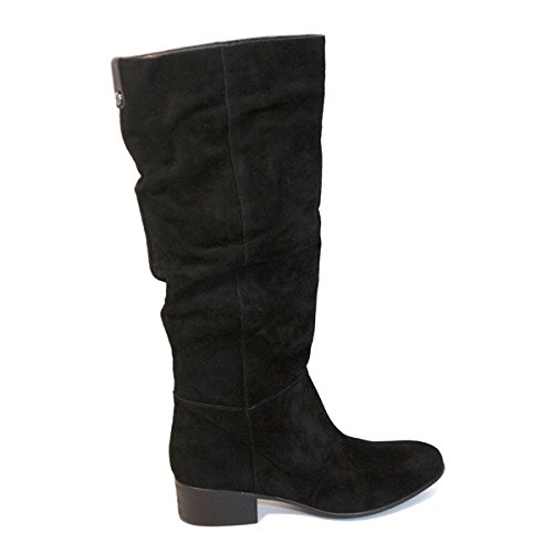 - Feature : Knee-length boot with low stacked heel, slouchy shaft, and logo button behind calf