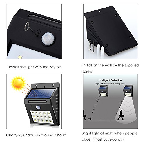 Newer Version: There are Bigger solar panel and Super bright 15 Lamp Beads. 8 hours charging time for up to 12 hours working time during the night.