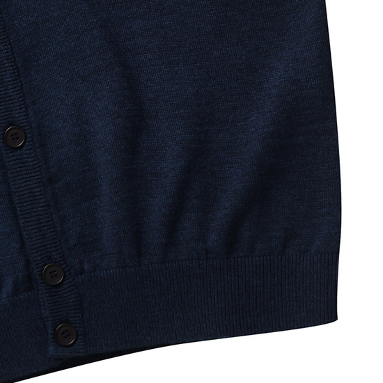 - 기본 V넥 디자인에 로고 버튼 여밈으로 단정함.