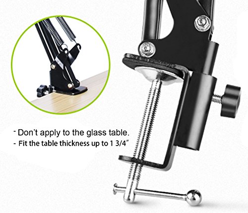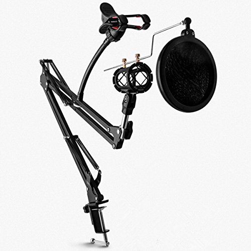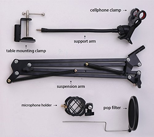 -. Feature : Package including 1 x suspension arm, 1 x table mounting clamp, 1 x cellphone clamp, 1 x cellphone support arm, 1 x shock mount, 1 x pop filter; Please viem the images for detail. / PLEASE NOTE: first, the microphone holder measures 1.75"; second, the table mounting clamp fit the table thickness up to 1.75"; third, the cellphone clamp open measures 4" / The adjustable scissor arm stand is made out of all steel construction, double-braced arms add strength, sturdy and durable. Folding type, convenient to carry. / The microphone wind screen pop filter mask shield can ensure that your tracks are audible and easy to understand. And also it will make sure your message loud and clear, and banish the dreaded hissing and lisping sounds. / Suitable for any stores, families, stages, studios, broadcasting and TV stations, etc.