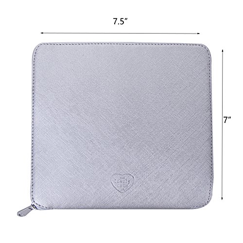 Over-the-shoulder handles, Heart logo plate on front of bag. Metallic foil heart logo on folded cover, zip top