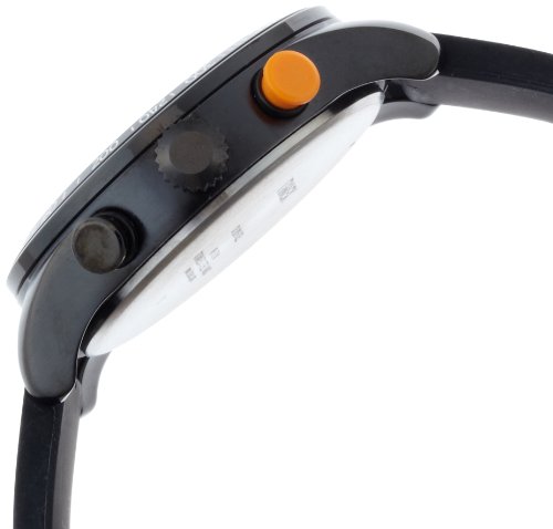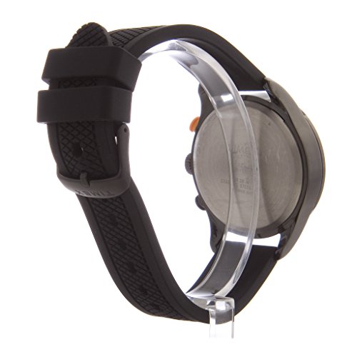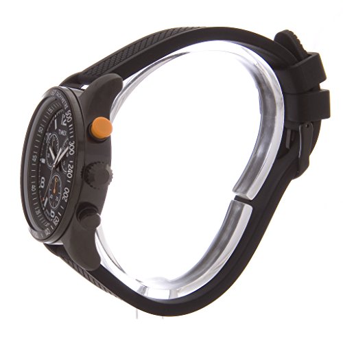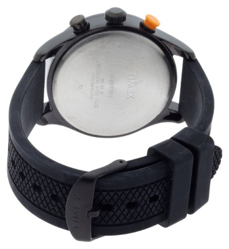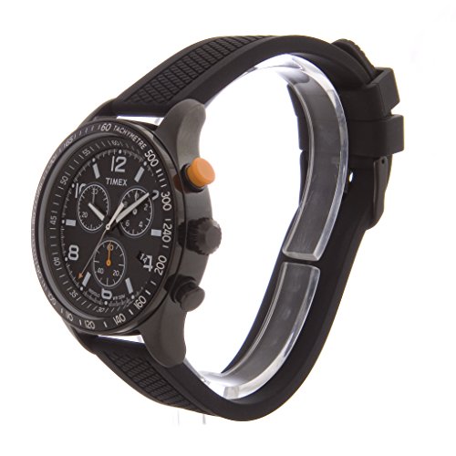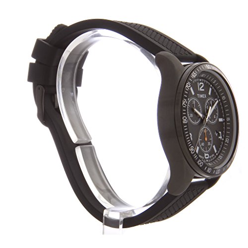 Black ion-plated brass case with a black textured silicone strap. Fixed black ion-plated bezel with tachymeter markings. Black dial with luminous hands and alternating Arabic numeral and index hour markers. Minute markers around the outer rim. Dial Type: Analog. Luminescent indiglo night-light. Date display at the 4 o'clock position. Chronograph - three sub-dials displaying: 60 second, 30 minute and 1/10th of a second. Quartz movement. Scratch resistant mineral crystal. Solid case back. Case diameter: 42 mm. Case thickness: 12 mm. Round case shape. Band width: 20 mm. Tang clasp. Water resistant at 50 meters / 165 feet. Functions: chronograph, date, hour, minute, second. Casual watch style. Timex Ameritus Chronograph Black Dial Black Silicone Mens Watch T2P043.Feature