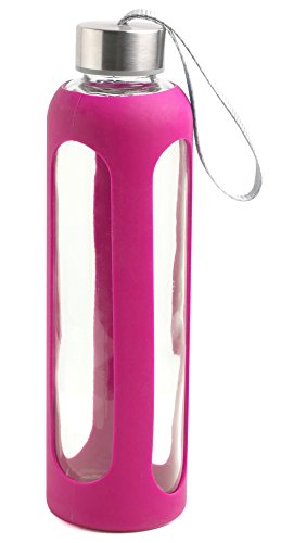 -. Feature : Reusable glass bottle with stainless steel cup + a protective silicone sleeve. / Environmental and High-quality Material: The bottles is made of ultra clear BOROSILICATE GLASS, which is known as a kind of special ENVIRONMENTAL and HEALTHY glass material. It is a kind of low expansion rate, high temperature resistance, high strength and hardness, high transmittance and high chemical stability. / The cap is made of high quality stainless steel, and seals are made of FOOD GRADE SILICONE, safe and environmental. / Easy to wash: The glass is super smooth, which is very easy to wash just by clear water. / Capacity: 20 oz. Dishwasher safe. Protective silicone can be easily removed and replaced.