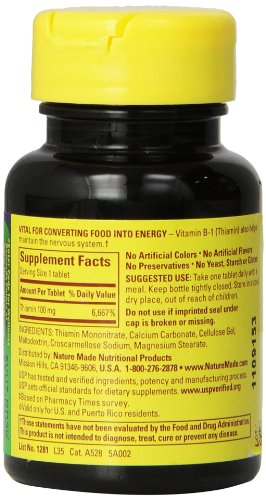 USP-Verified Dietary Supplement. Recommended by pharmacists. Vital for converting food into energy - Vitamin B1 (Thiamin) also helps maintain the nervous system. No artificial colors. No artificial flavors. No preservatives.Feature