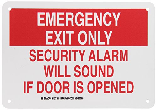 Brady 127165 Fire Safety Sign, Legend "Emergency Exit Only Security Alarm Will Sound If Door Is Opened", 7" Height, 10" Width, Red on White