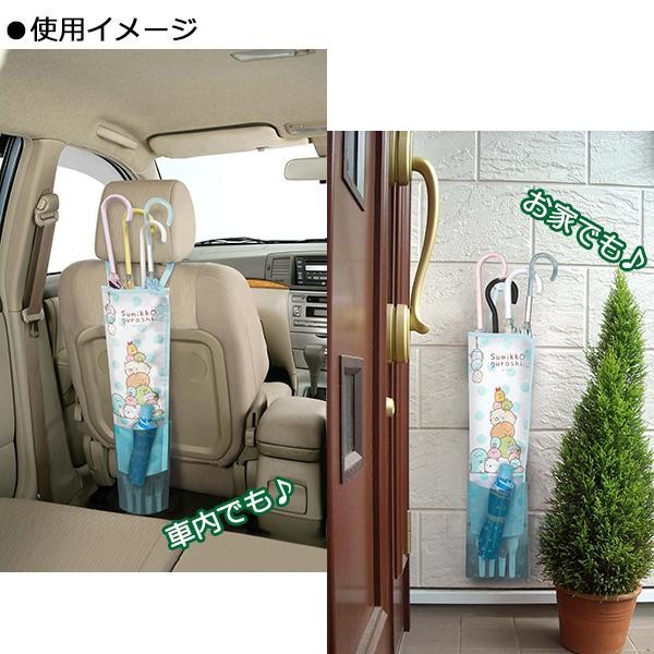 | 車のヘッドレストに取り付けて、濡れた傘を入れておけます。前面のポケットには折り畳み傘を入れることができます。車内はもちろん、お家の玄関でもご使用いただけます。 |