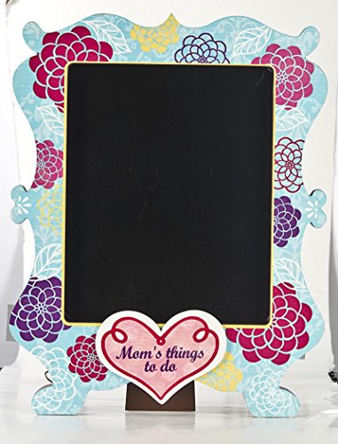 - Chalkboard stand features a uniquely shaped blue frame with bright flowers in shades of pink, purple and yellow