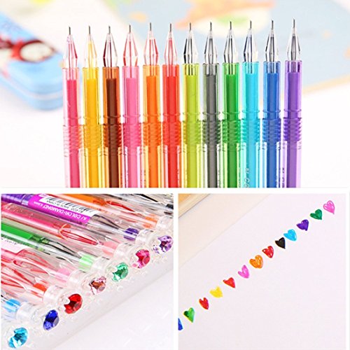 -. Feature : Gel Pen Set includes 12 different colors, with red, gold red, coffee, yellow, pink, light pink, blue, night blue, orange, purple, black, green. The colors are bright and vivid. Perfect for children and your inspiring artists! / The Gel Pen Set is ideal for Scrapbooking, Journals, Drawing, Coloring, Diary, Nail Art, Greeting Cards, Party Invites, Crafting, Doodling, Decorating, Stamping, Tattoos, & More! / The pen point of gel pen is in a diamond shape, which is unique, little fresh, lovely, vibrant, brilliant and eye-catching. / Very cute, useful and fasion; creative and interesting props to take with! / Perfect forSchool, Office, Family use or as a gift for your kids, friend or personal collection
