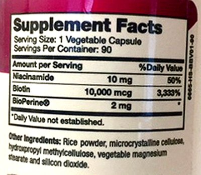 PURE biotin in each capsule. It is enhanced with Niacin and patented Bioperine®. One bottle has 90 odorless vegetable capsules that are easy to take and absorb. Sufficient for 3 month supply.