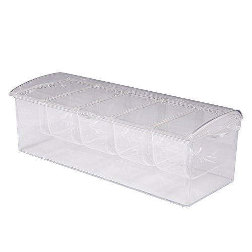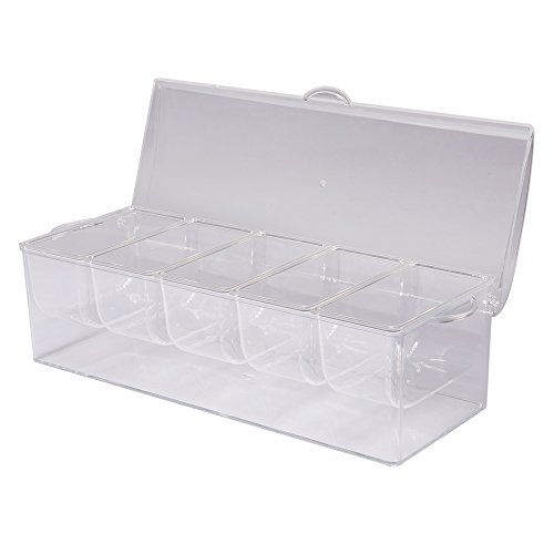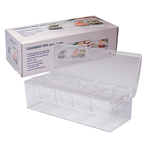 Studio : Teberyc Publisher : Teberyc Product Description Our chilled condiment caddy keeps condiments deliciously fresh and cool. Durable plastic condiment caddy's 5 removable compartments serves sauces, condiments and cocktail garnishes; bottom section holds ice for easy chilling. Hinged lid shields contents from air and insects; side handles allow easy transport. 14 1/2"L x 5 1/2"W x 4"D overall; each compartment is 5 3/4"L x 2 7/8"W. 0