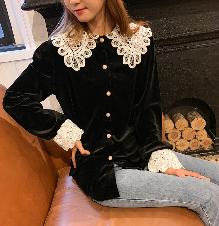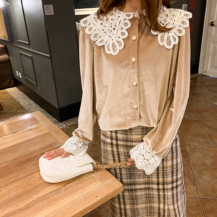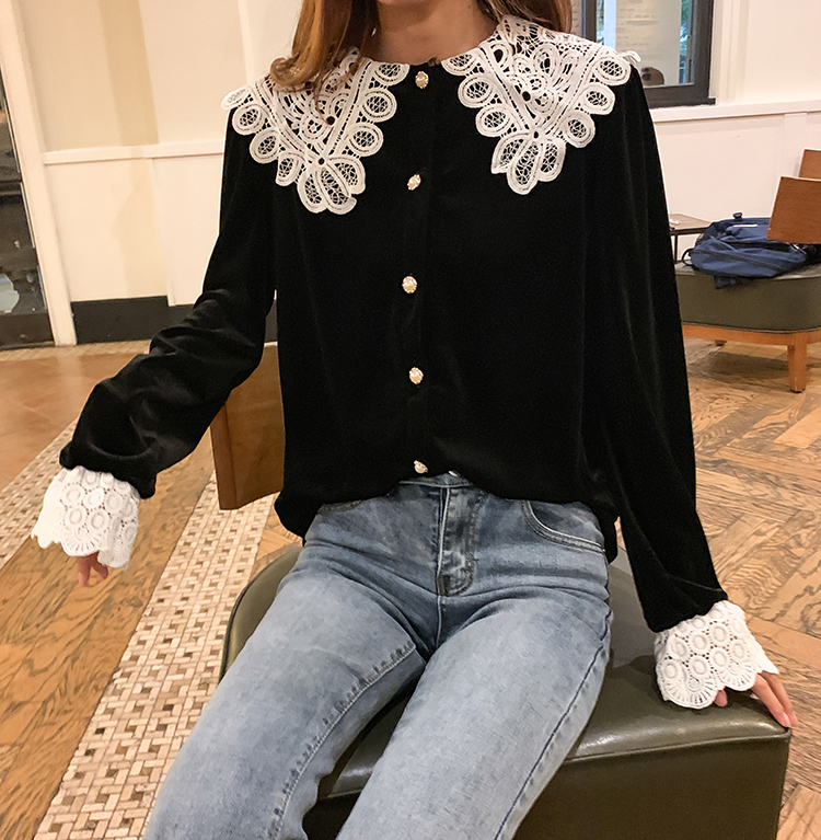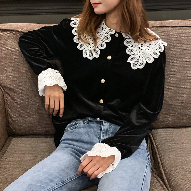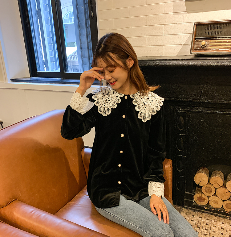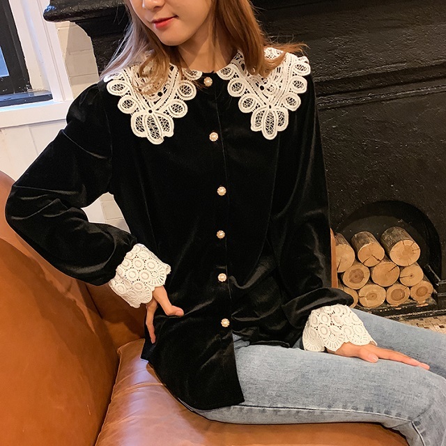 つや感のあるベルベット生地と大きなレースの襟が目を引くきれいめブラウスです。