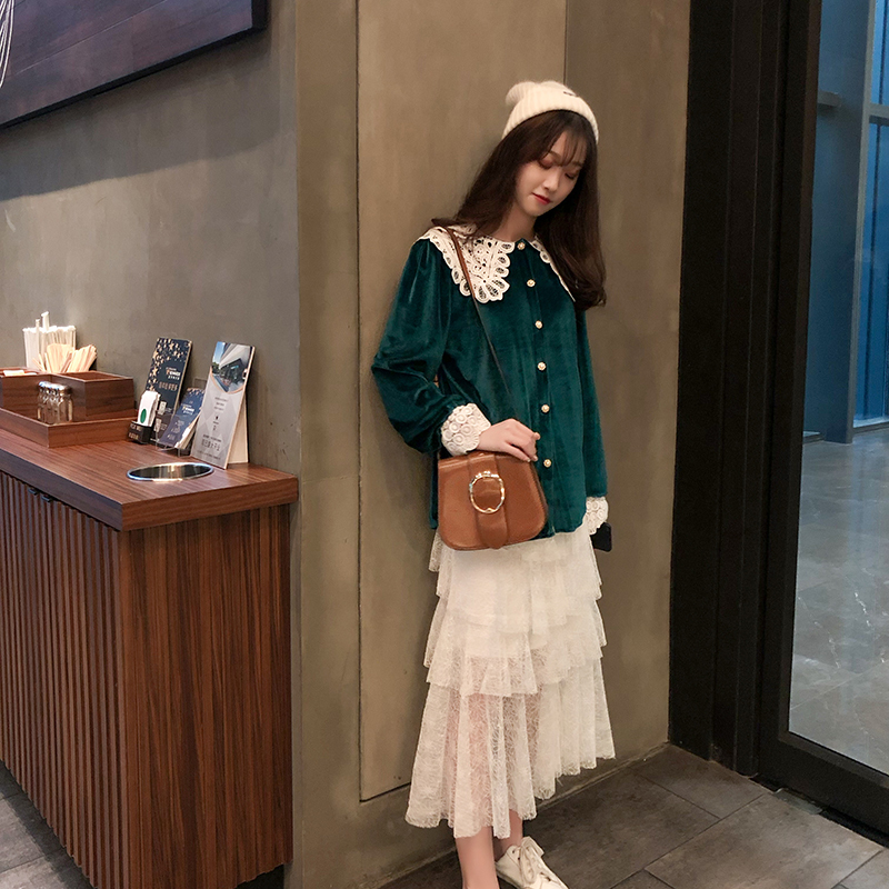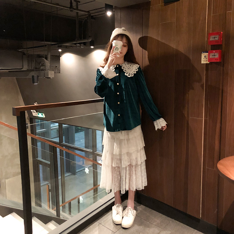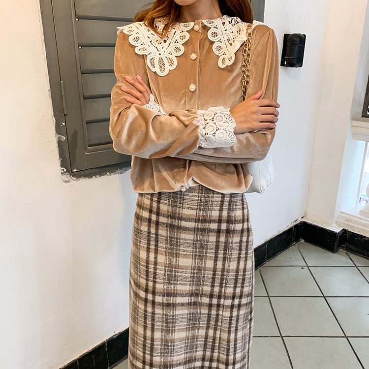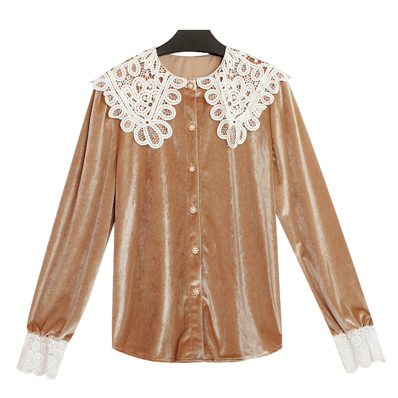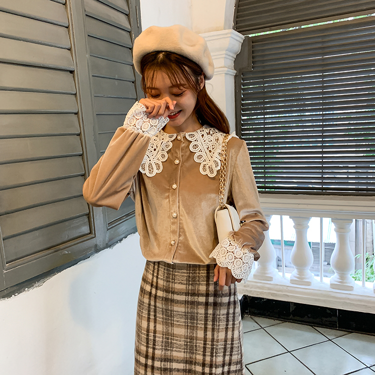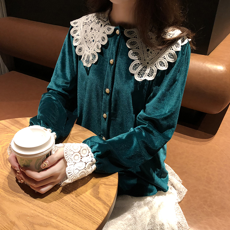 つや感のあるベルベット生地と大きなレースの襟が目を引くきれいめブラウスです。